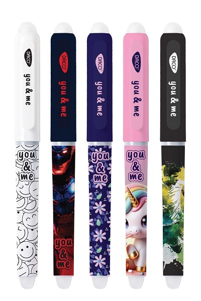 - Un stilou cu radieră You and Me Daco Floral cu cerneală termosensibilă este utilizat în special de cei care învață să scrie, deoarece permite corectarea ușoară a erorilor prin ștergerea textului cu ajutorul radierei termice.
